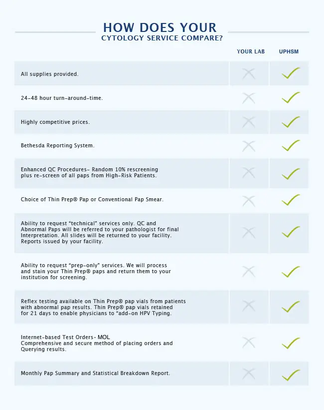 UPHS – Marquette has a fully accredited, full-service clinical laboratory. Our ASCP certified staff of cytotechnologists and pathologists ensure that we provide the highest quality cytology services. Enhanced QC procedures, our Internet-based Test Orders – MOL, and monthly pap summary / statistical breakdown reports are a few of qualities that make UPHS – Marquette the reference laboratory of choice.